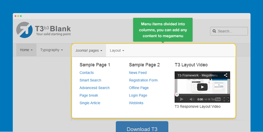 我們的T3框架是最流行的Joomla模板框架。它控制我們的T3基礎模板和用于Joomla 1.5、2.5和3。 為便于升級框架是在插件格式和單獨安裝。擁有超過3年的積極發展的T3框架已經走過了漫長的道路,穩定,用戶友好,功能豐富,易于定制和廣泛的響應布局支持不僅看起來不錯,在所有的瀏覽器和設備,而且工作就像一個魅力。