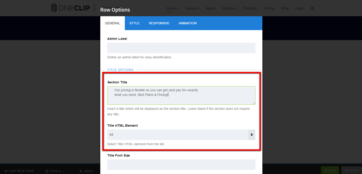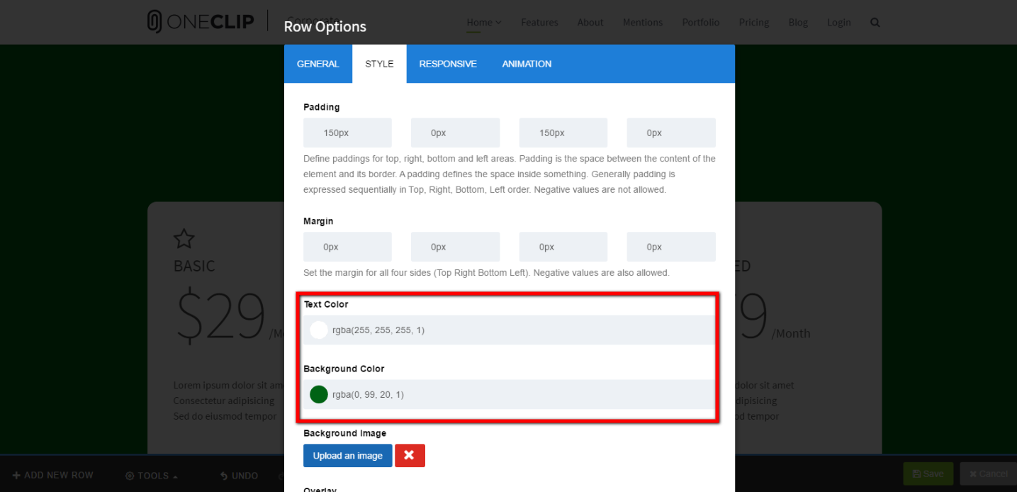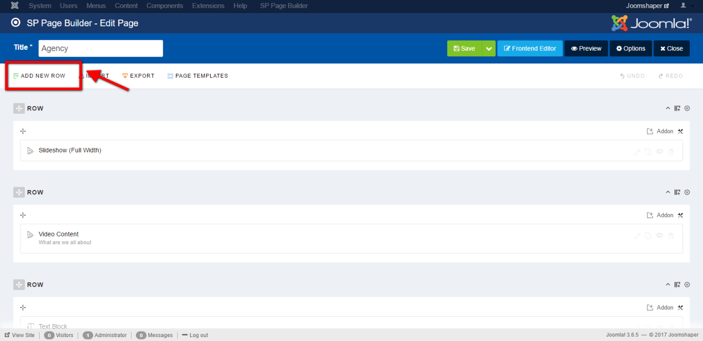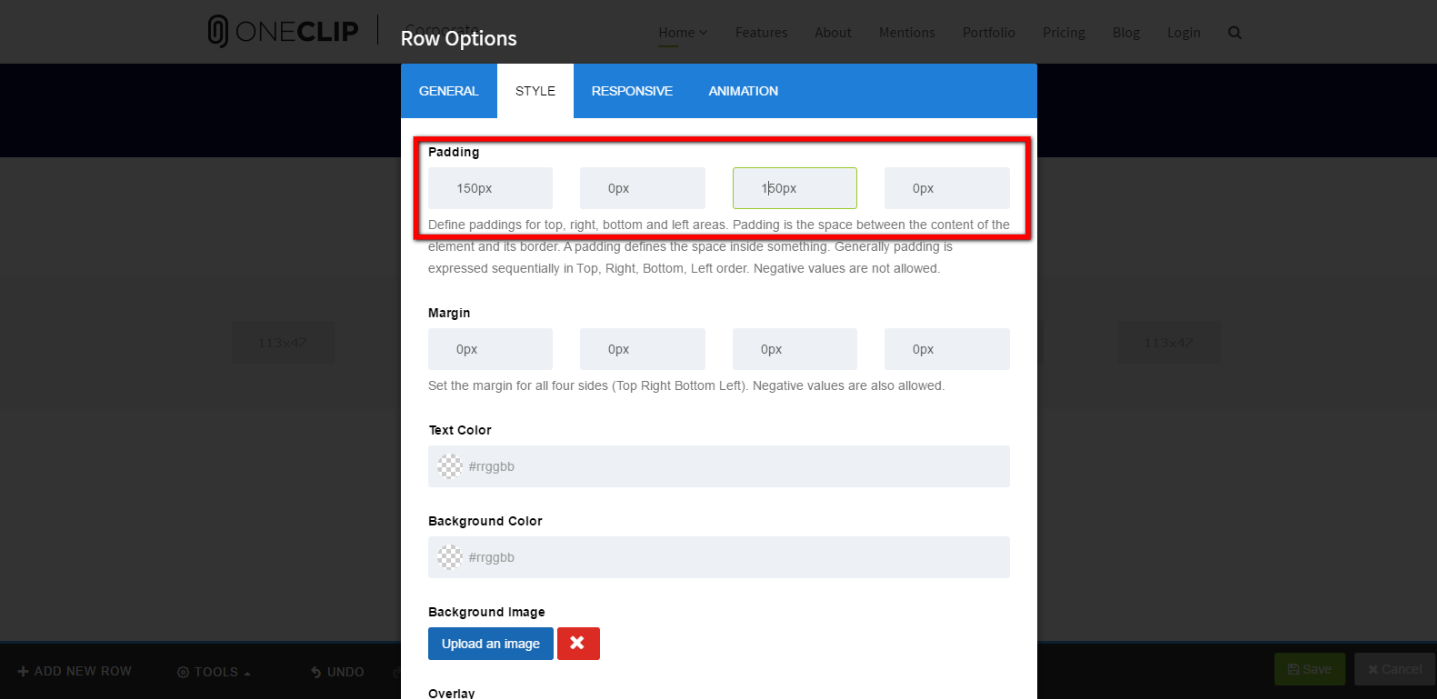 現在打開前端編輯器并在新添加的行上單擊行選項。選項位于編輯器的左上角。現在在樣式菜單中,調整行的填充和邊距。
