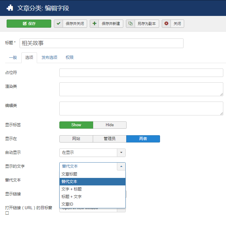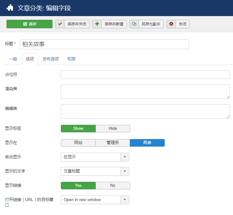 六翼開發(fā)的自定義字段之單篇文章插件,可以貼心地解決這類問題,安裝并啟用插件后,她能在joomla后臺的自定義字段類型內添加一個新的類型,創(chuàng)建后可以方便地點選站內已發(fā)布的任意文章,可以指定默認分類,更能直達某個分類下的文章,網(wǎng)站的編輯人員只需要輕輕點幾下鼠標,不用敲擊鍵盤輸入任何字符,就能輕松找到想要關聯(lián)的文章。