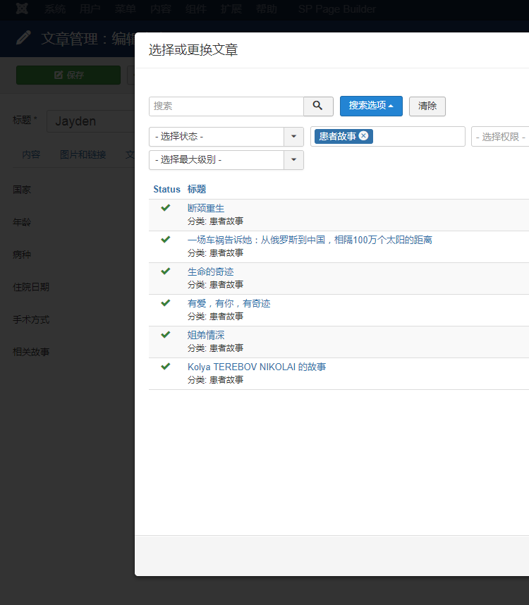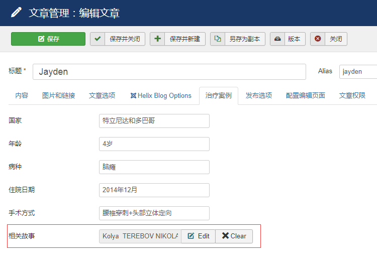 比如你要策劃的網(wǎng)站,需要有個欄目來介紹一些病種案例,需要詳細地介紹此人的性別、年齡、所患病種等等,分開這類屬性信息便于前臺更靈活地輸出,通常我們采用joomla自定義擴展字段功能來處理。現(xiàn)在我們需要另外一個需求,需要介紹此病人抗擊病魔的感人故事,而他的故事文章已作為另外一個分類下的文章被規(guī)劃,這樣我們就需要在這兩篇文章之間建立關聯(lián)關系。通常我們可以添加個擴展字段,用來輸入另外一篇文章的ID,這是一個解決方案,但這要求網(wǎng)站編輯人員要了解什么是文章ID,而且找到另外這篇相關的文章需要好幾步驟操作,這給網(wǎng)站的維護工作帶來了極大的不便,降低了網(wǎng)站編輯人員的工作效率。